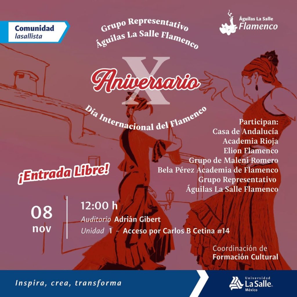La Universidad La Salle México celebrará en noviembre el décimo aniversario de su grupo representativo Águilas La Salle Flamenco con dos citas en el Auditorio Adrián Gibert: el espectáculo Andaluz y una jornada académica por el Día Internacional del Flamenco, en la que participarán diversas escuelas invitadas.